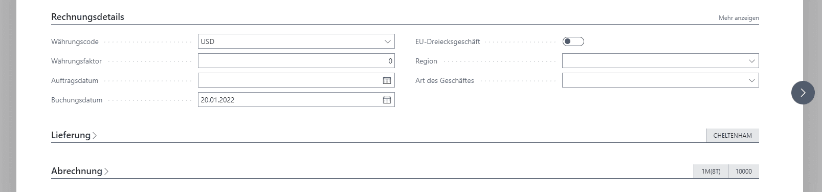 • Währungscode: Code der Belegwährung. Relation zur Währung in Business Central.