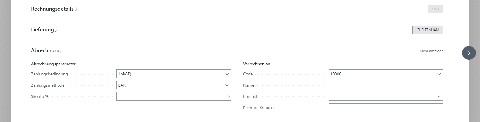 • Zahlungsbedingung: Bedingungen zur Zahlung des Belegs. Relation zu den Zahlungsbedingungen in Business Central.