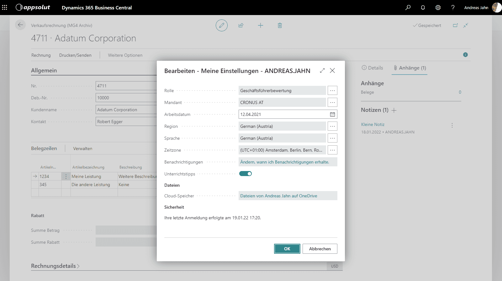 Über die persönlichen Einstellungen wird die Sprachversion von Business Central gewählt. Diese Auswahl wirkt sich automatisch auch auf die Benutzeroberfläche des MG4 Belegarchivs aus.